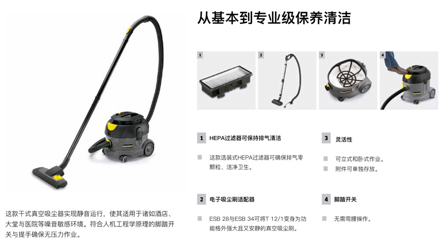嘉潔環(huán)保提供德國(guó)卡赫KARCHER T12/1 干式真空吸塵器,這款干式真空吸塵器實(shí)現(xiàn)靜音運(yùn)行,使其適用于諸如酒店、大堂與醫(yī)院等噪音敏感環(huán)境。嘉潔環(huán)保價(jià)格實(shí)惠,歡迎咨詢。